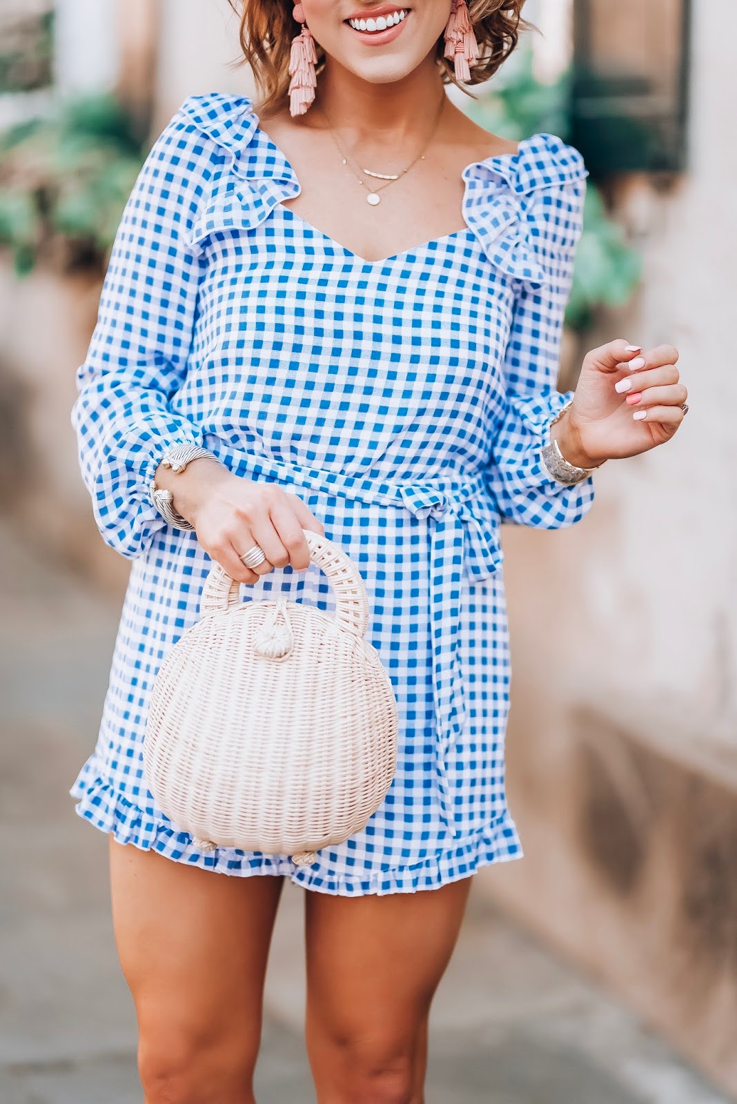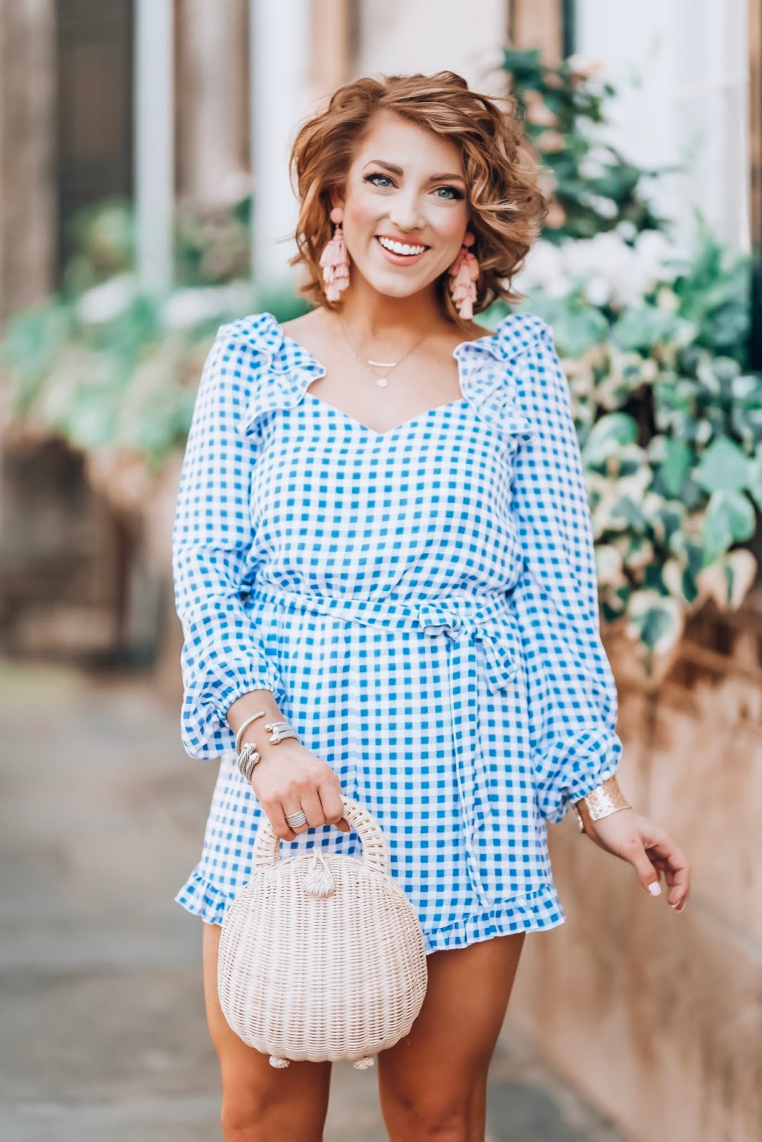 I’m so excited to be sharing the details on this adorable romper with y’all today. It’s no secret that I LOVE gingham! So much that I probably have more gingham than any other print in my closet. I have also been living in rompers this season! I know that I’ll continue to do so as the weather warms up even more. Rompers are such an easy piece to style. They really don’t require too much thought and are such a good throw-on-and-go option. This one is everything my romper dreams are made of haha! I adore the small gingham print, the tie at the waist and the ruffles on the sleeves. You can easily casual this one down with some flat sandals or mules and dress it up with heels, as I have it here. I love to style blue and white with pink accessories!