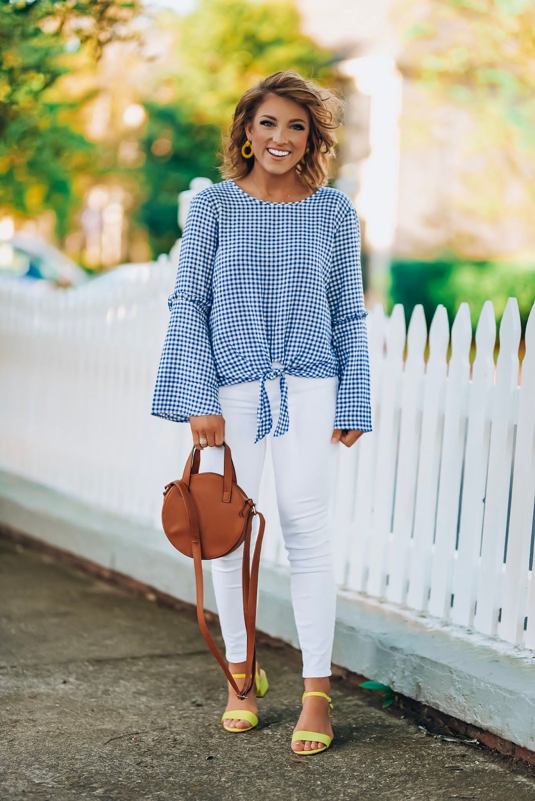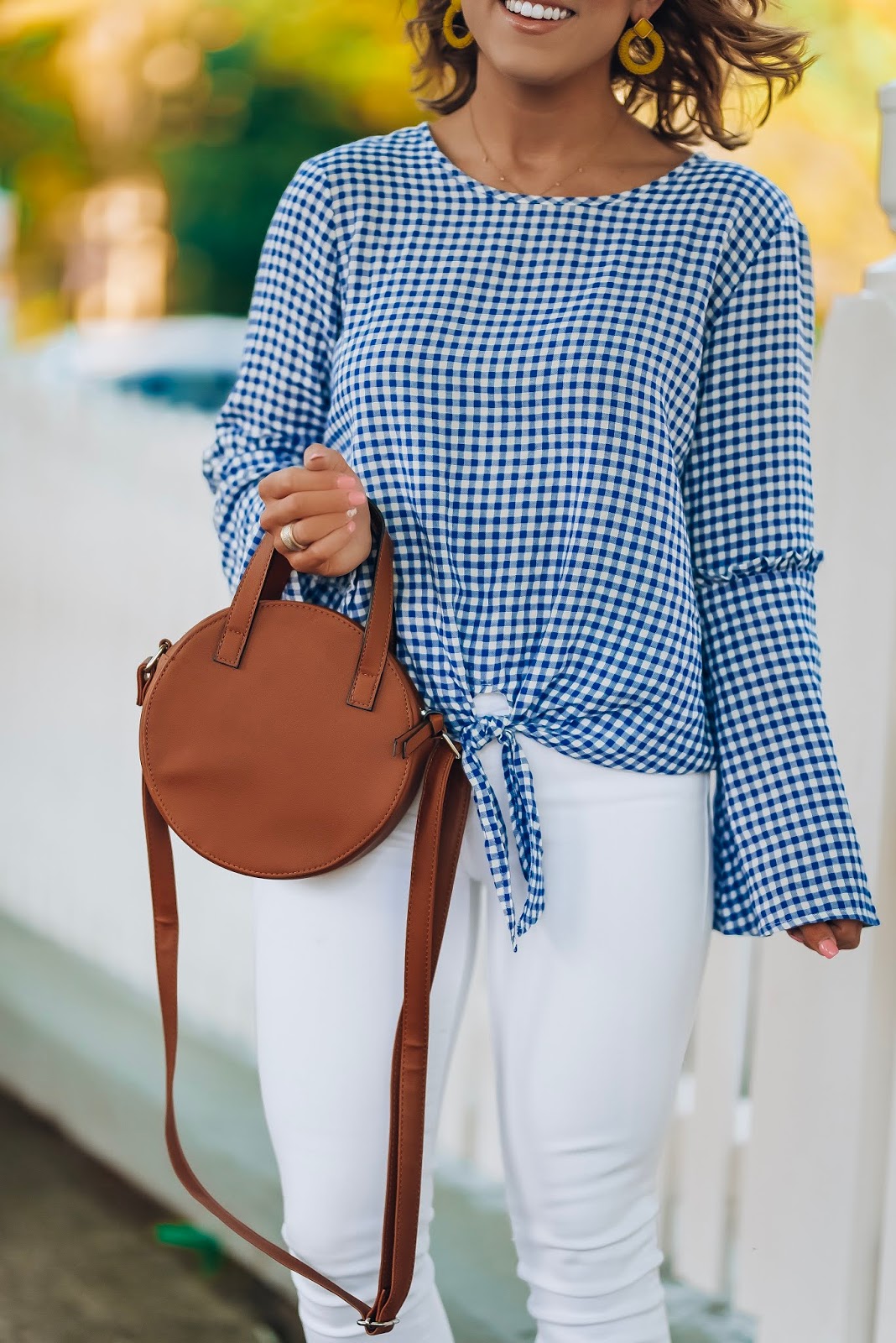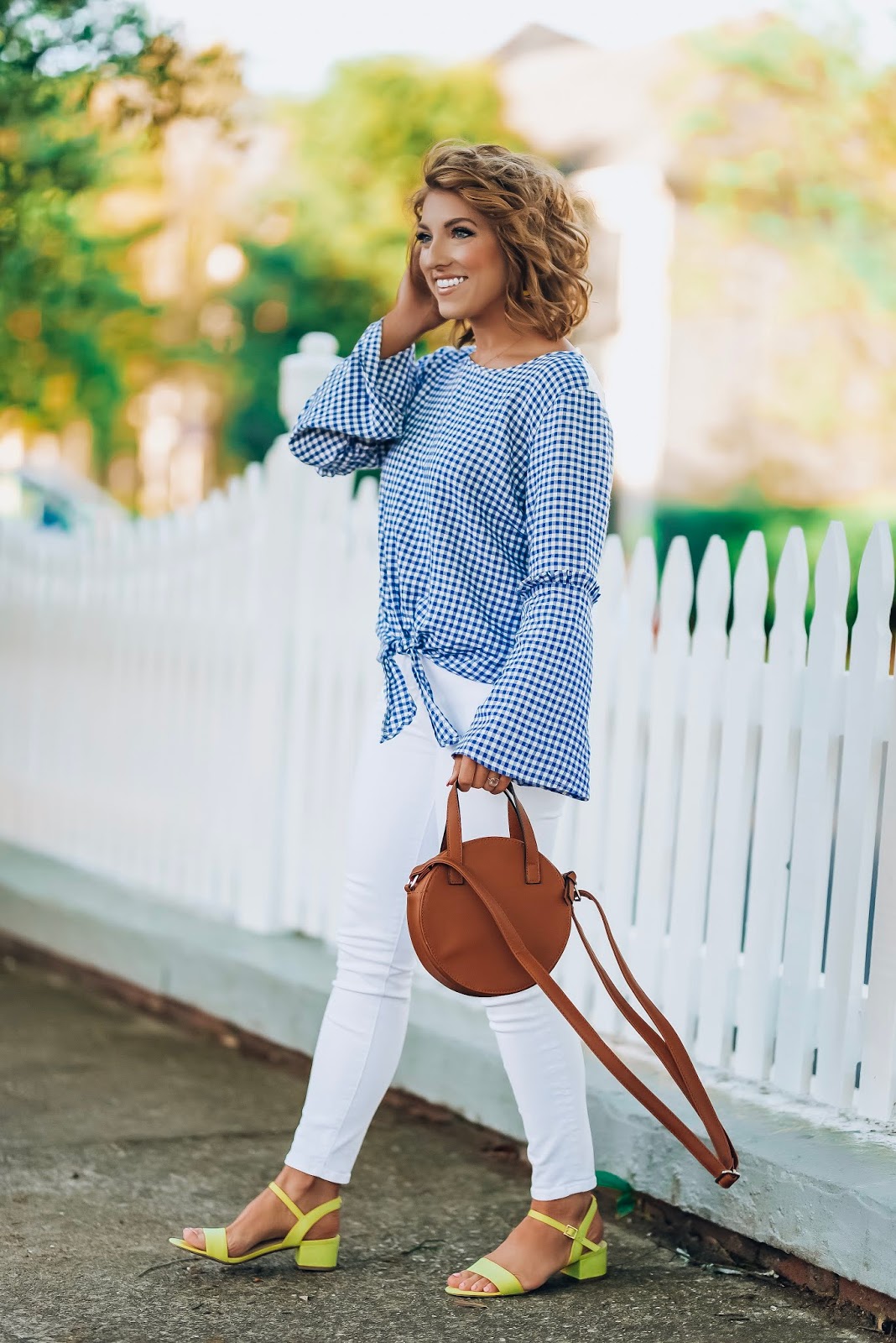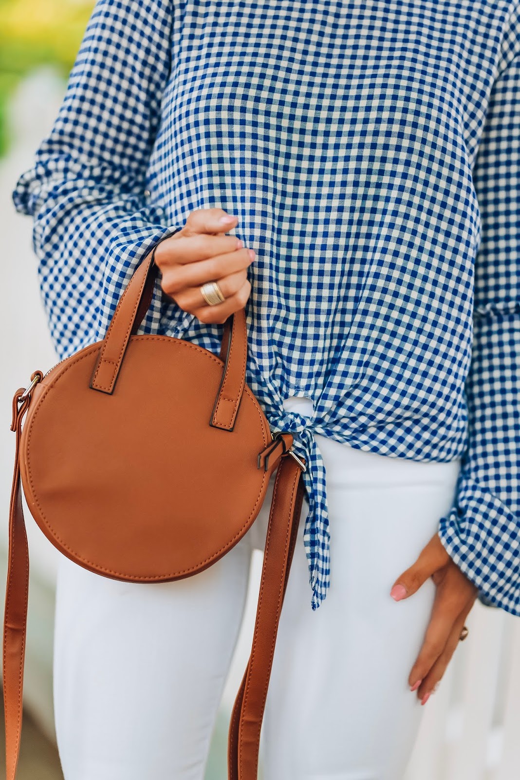 Now for a little on our looks! Like I said, I can search for pretty much anything on Walmart and find what I’m looking for! For example, I typed “Gingham Top” into the search bar on their site and found this adorable blue and white gingham tie-front top! Y’all it’s just the cutest thing and is only $13. It feels so much more expensive than that! I love how the back is solid ivory, and the gingham print follows all the way around the neck-line (even to the back) and outlines that little button key-whole in the back. The details are pretty much perfection for this top. It also comes with the cutest tassel necklace. I decide not to wear it in this post, as I opted for yellow accessories, but I will definitely be wearing it with other pieces. My sandals are one of my tried and true, favorite brands that has created a line named “Circus” especially for Walmart. The quality of the shoes is just as amazing, but the price is so much less! I love having a lemon yellow pair for spring and summer. These run TTS and are under $40! I know I’ll get a lot of use out of them. They’re also very comfortable and have a cushioned footbed. I also have this pink pair by the same brand that I just love as well! And the last piece I want to mention is this cognac circular bag. I also have it in pink and have gotten so many compliments on it! When I tell people it’s from Walmart and only $14, they’re always shocked! It comes in several prints and colors.