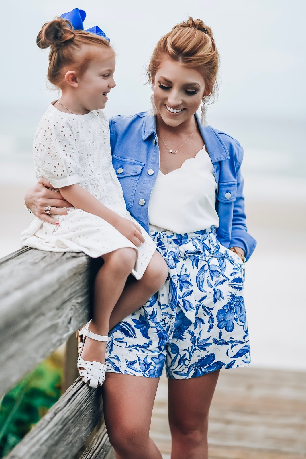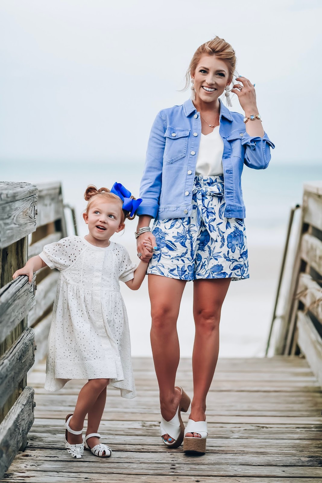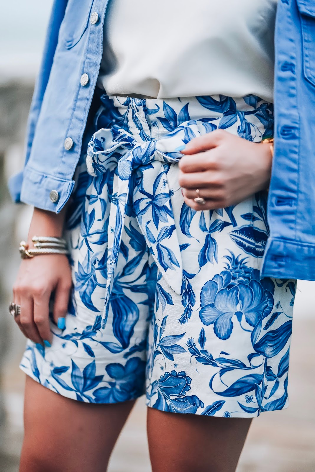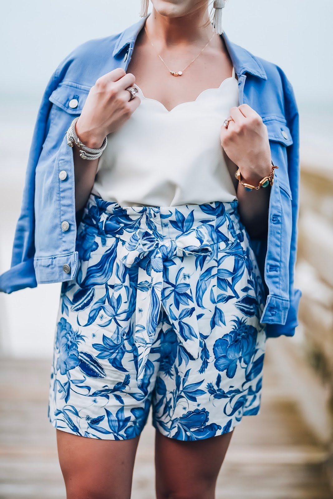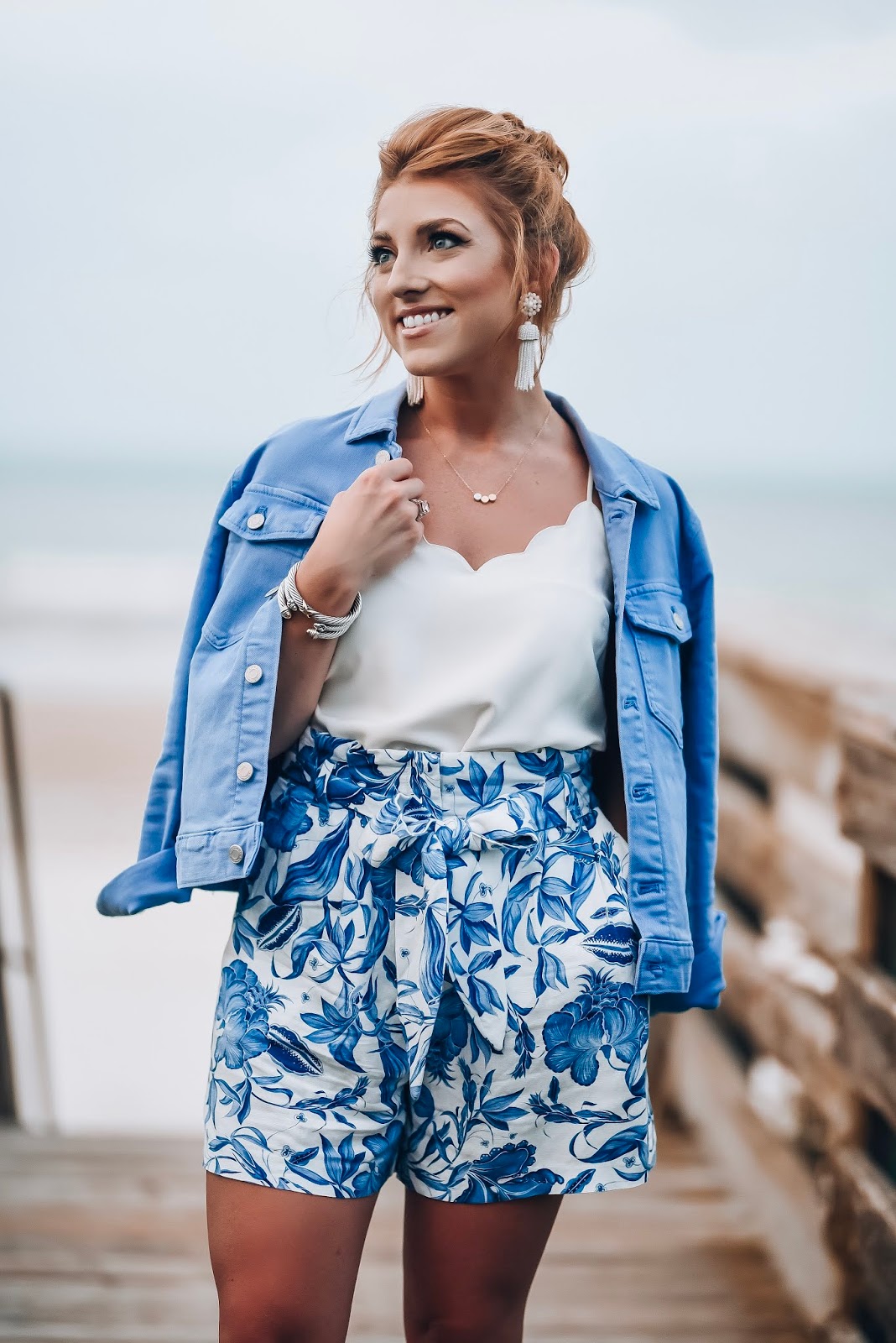 Blue Hues: Under $50 Blue Denim Jacket + Under $20 Blue & White Paper Waist Shorts  - Something Delightful Blog - Style for Women and Kids