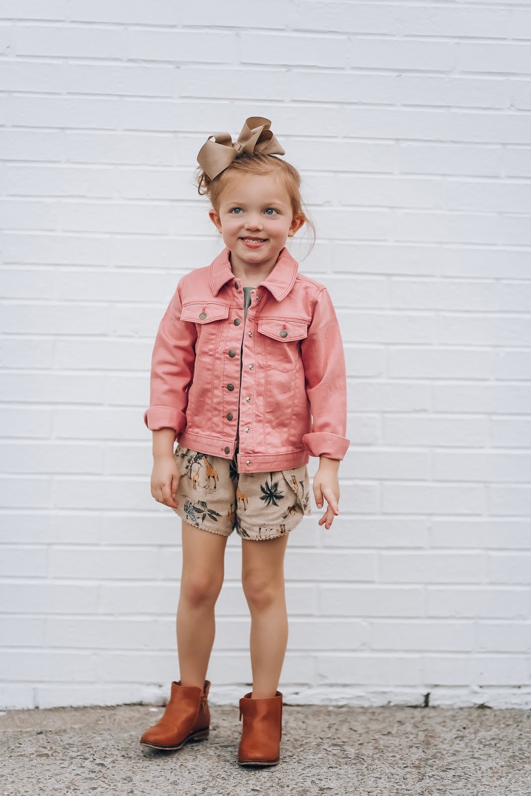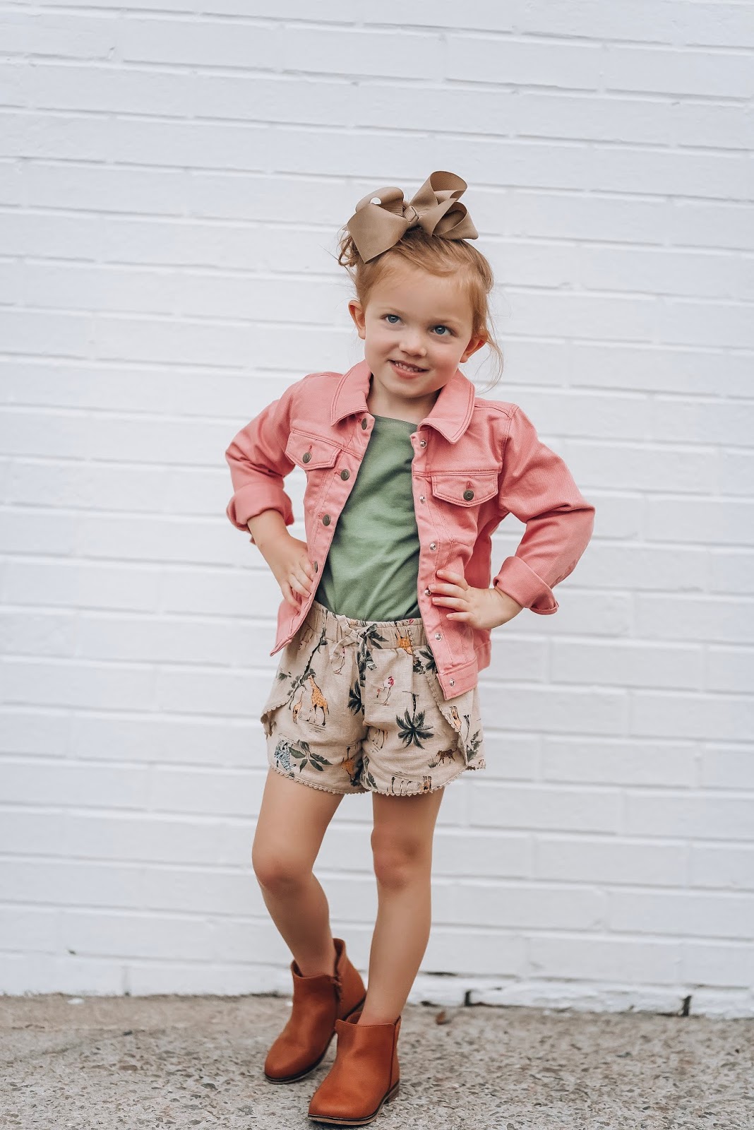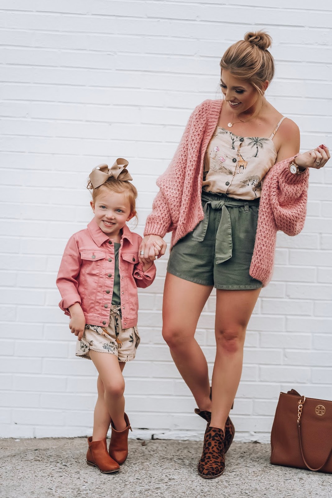 That’s exactly what we did with the look here. I’ve got my green shorts and Madeline has her green shirt. I have my safari print cami and Madeline has her safari print shorts. My top, Madeline’s shorts AND her jacket are all on sale for under $30 with an extra 25% off! This fun safari print literally comes in a piece for the entire family and so many styles available for each family member. Its so fun! I also found my olive green shorts on sale for $27 and in stock in all sizes! They’re a great transition pair as well. This pretty pink cardigan is another piece I’m just loving right now and am so excited to take into fall. It’s only $51!