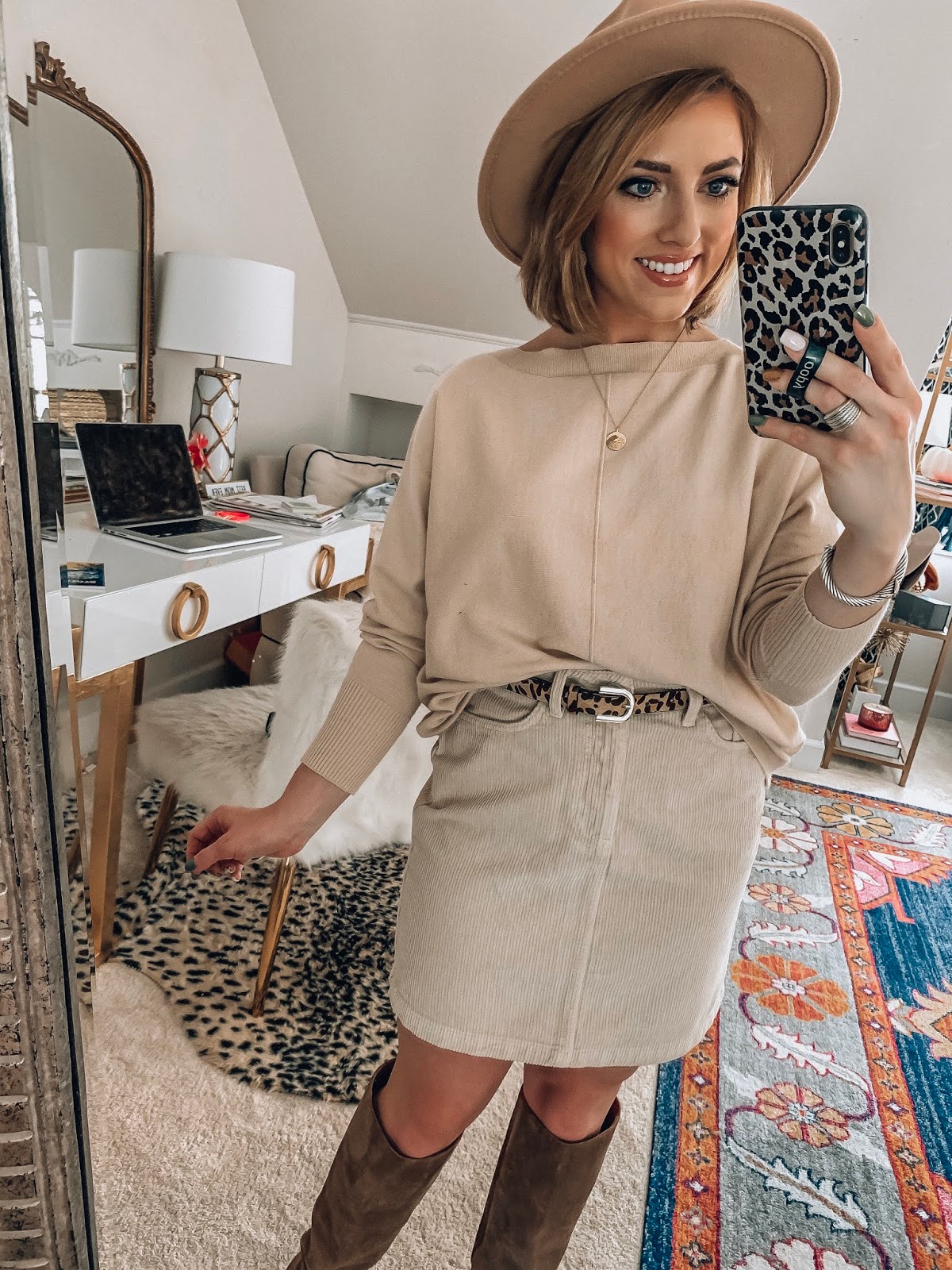 Brown/Beige Stripe Sweater ($40) – Wearing Size XS // Khaki Corduroy Skirt ($32) – Runs small!!! I normally size up one size in this brand anyway, and with this skirt, I sized up another size. So size up two (could even try three) sizes from your regular. // Booties // Hat