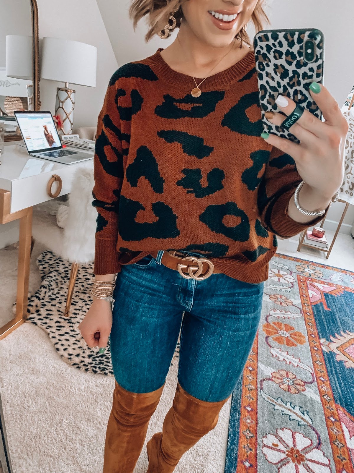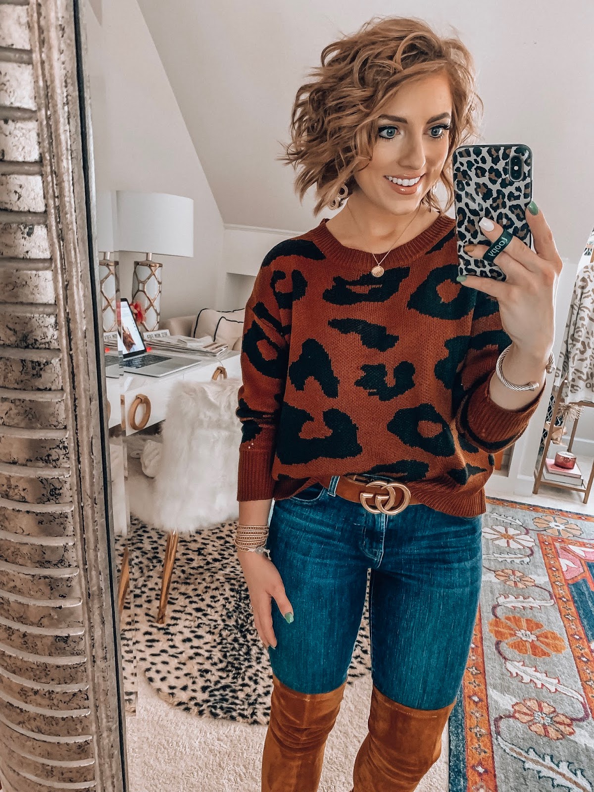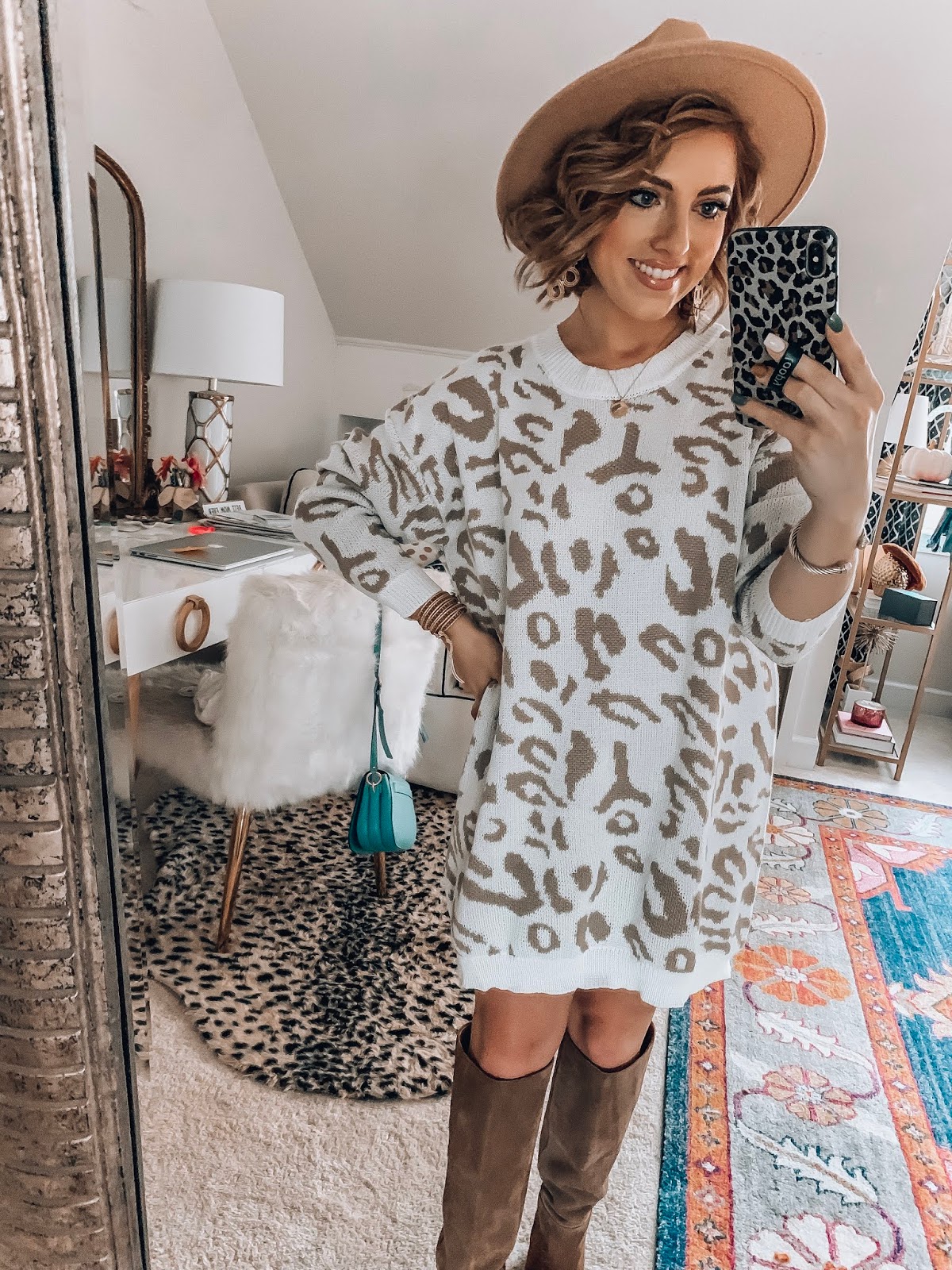 $30 Leopard Print Tunic Sweater – Wearing size small (I’m 5’2 and like it as a sweater dress, but it would be equally as cute over some skinny jeans or leggings with OTK boots or mules. Add on a skinny belt for another fun touch.) // Boots // Hat