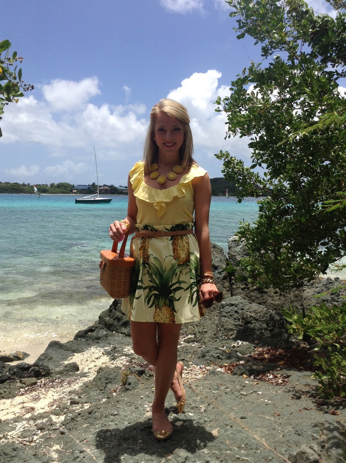 Along with my obsession for anchors, lobsters, bows, and more, I now have a love for pineapples. J.Crew came out with several darling pineapple pieces. I saw the skirt and then the price, which was not so inviting. Preppy Pink Shop (my favorite Etsy shop), not only has a pineapple skirt that is 10x cuter, but the price is also fabulous. I was so happy to be able to take it along with me to St. Thomas, as it made the perfect outfit for this tropical climate down here. I will enjoy it thoroughly. There will be more to come on St. Thomas and Preppy Pink Shop!
