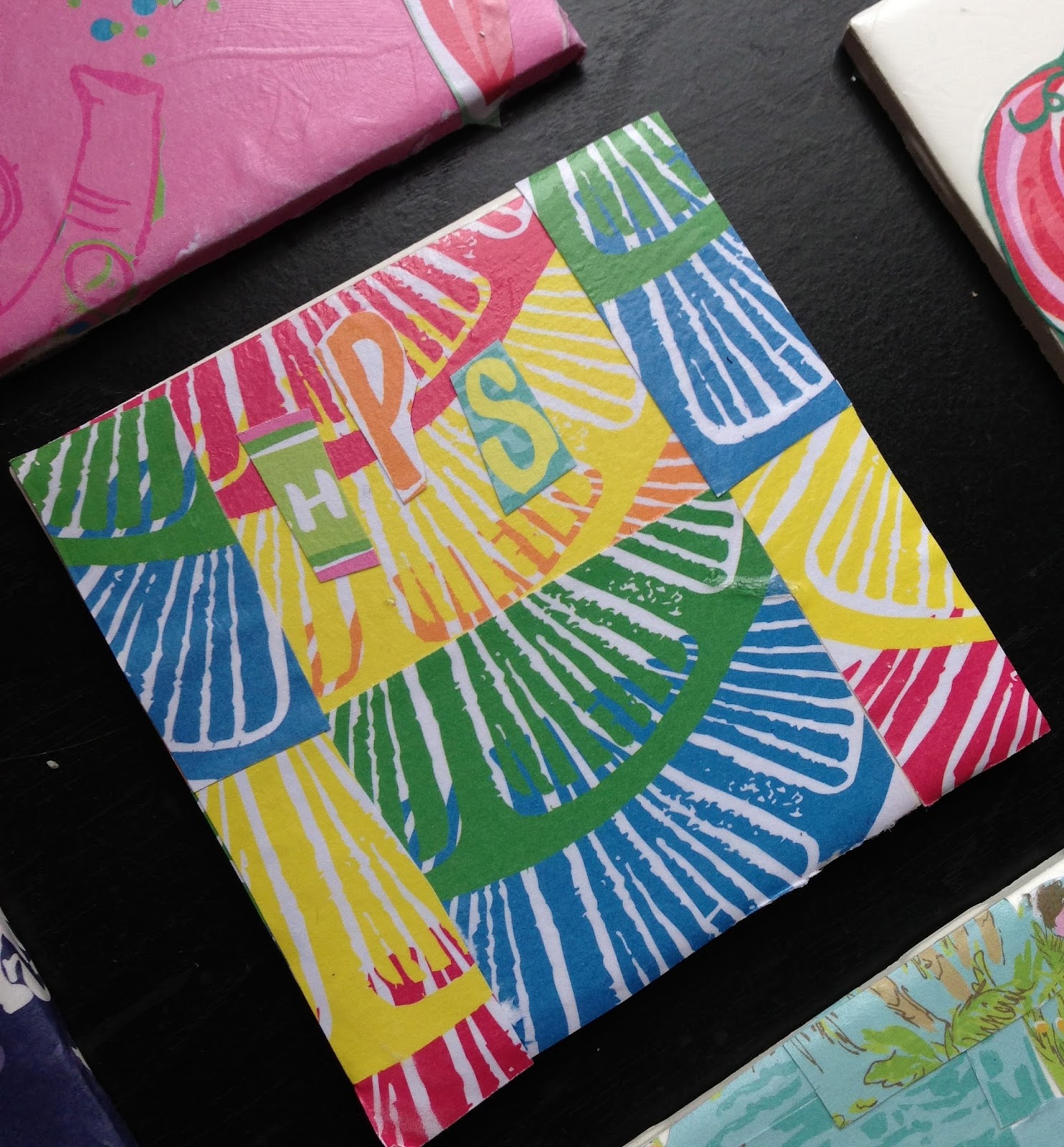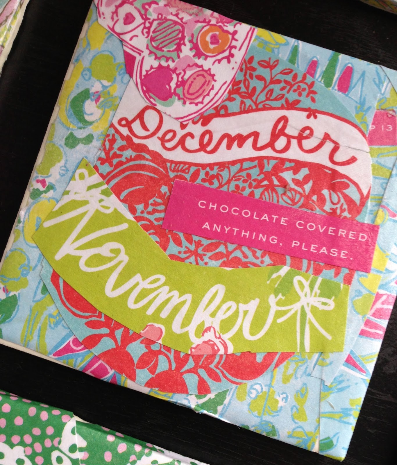 These were so fun to make! All you need are some plain tiles (.16 each from Walmart), your old Lilly agenda, scissors, and lots of mod podge! Be sure to cover the entire coaster with mod podge once you have covered your tile in the Lilly paper.